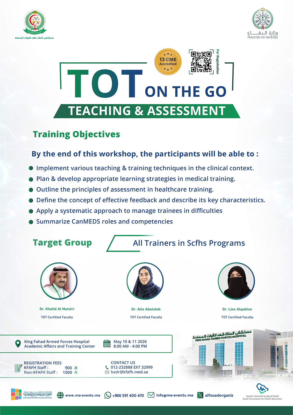 أتقدّم بخالص الشكر والتقدير إلى اللجنة العلمية على جهودها المتميزة في إعداد برنامج علمي متنوع المسارات وورش العمل، يعكس تطلعاتنا في مستشفى الملك فهد للقوات المسلحة بجدة.