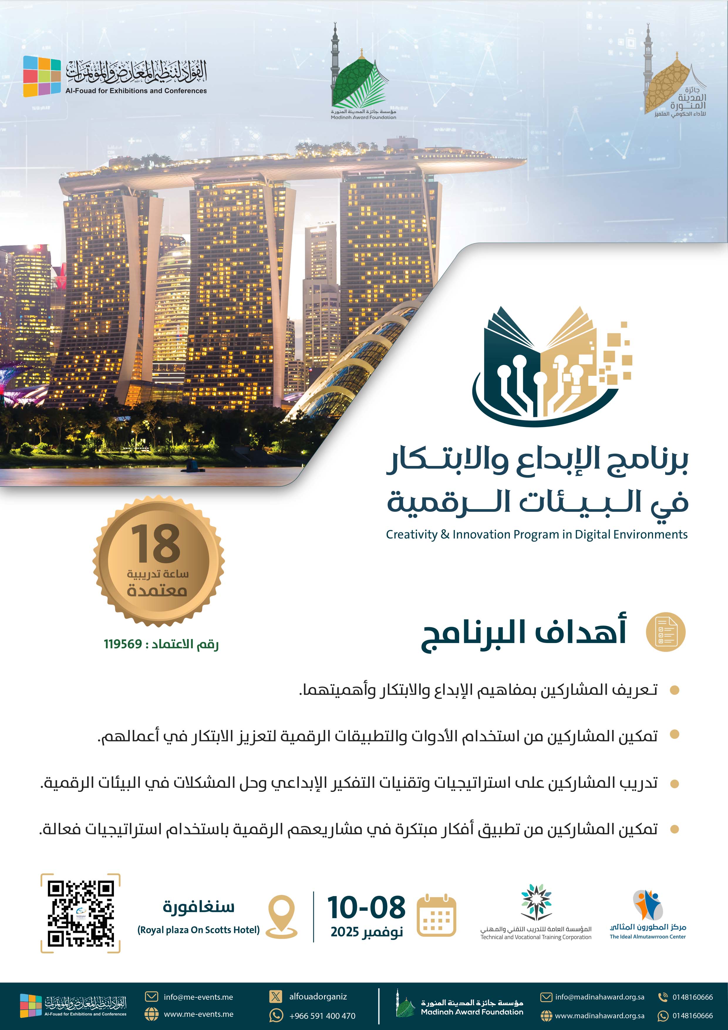 تـعريف المشاركني مبفاهيم الإبداع والابتكار وأهميتهام. متكني المشاركني من استخدام الأدوات والتطبيقات الرقمية لتعزيز الابتكار في أعاملهم. تدريب المشاركني على استراتيجيات وتقنيات التفكري الإبداعي وحل المشكلات في البيئات الرقمية. متكني المشاركني من تطبيق أفكار مبتكرة في مشاريعهم الرقمية باستخدام استراتيجيات فعالة.